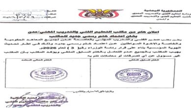 إعلان هام صادر عن مكتب التعليم الفني والتدريب المهني – العاصمة عدن