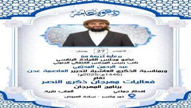 دعت اللجنة التحضيرية لمهرجان ذكرى النصر، جميع أبناء العاصمة عدن والمحافظات المجاورة للمشاركة في فعاليات المهرجان وحضور الإفطار الجماعي المقرر…