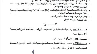 أصدر المدير العام للمؤسسة الاقتصادية اليمنية، العميد سامي صالح السعيدي، القرار الإداري رقم (6) لسنة 2025، قضى بتعيين العقيد فارس…