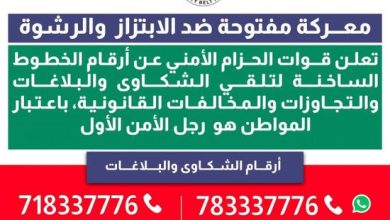 نشرت قوات الحزام الأمني، اليوم الأحد، أرقام الخطوط الساخنة المخصصة لبلاغات حالات الابتزاز، والرشوة، والمخالفات القانونية، المعلنة بوقت سابق، في…