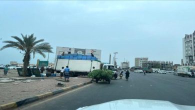 حادث مروري في فتحة كابوتا بعدن يتسبب بانقلاب شاحنة تجارية