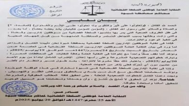 أصدرت النقابة العامة لموظفي السلطة القضائية في محافظة شبوة، بيانًا قويًا، يعكس التحديات الجسيمة التي يواجهها منتسبو السلطة القضائية، من…