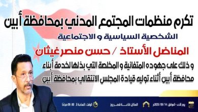توجيه دعوة لأبناء أبين للحضور والمشاركة الفاعلة في الحفل التكريمي للأستاذ حسن غيثان يوم غدٍ الأحد
