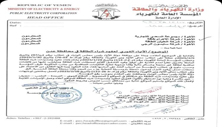 أصدرت المؤسسة العامة للكهرباء قرار إنهاء العقود مع ملاك الطاقة المستأجرة (المشتراة) العاملة بالديزل في العاصمة عدن بشكل فوري، وعدم تجديد التعاقد.