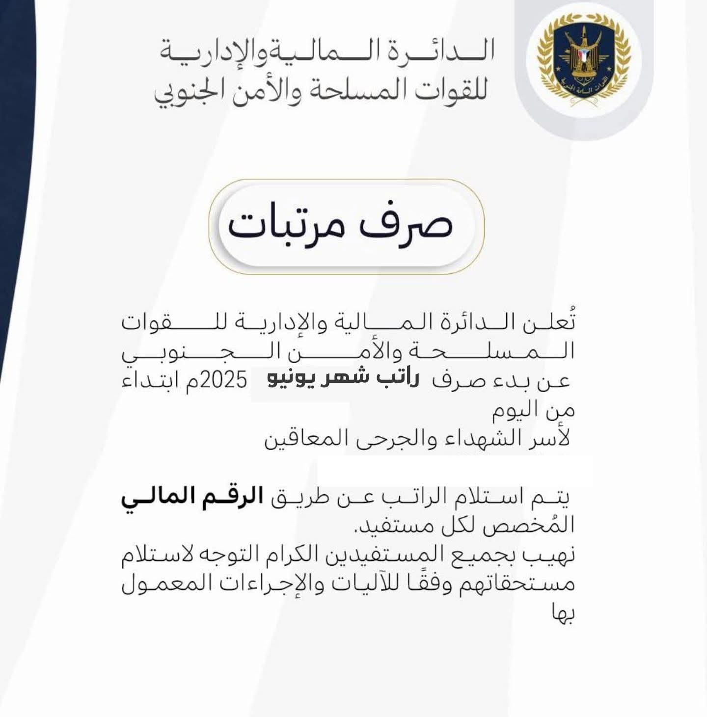 الدائرة المالية بالقوات الجنوبية تعلن بدء صرف راتب يونيو 2025 لأسر الشهداء والجرحى المعاقين