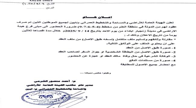 دعت الهيئة العامة للأراضي والمساحة والتخطيط العمراني بمحافظة أبين، المواطنين الحاصلين على عقود في مخططات العلم (4–5–6–7–9)، إلى استكمال ملفاتهم خلال مدة أقصاها ثلاثون يومًا ابتداءً من الأحد 14 سبتمبر 2025، عبر الحضور إلى مقر فرع الهيئة في مدينة زنجبار.