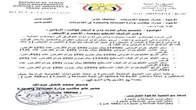 أصدر مدير عام مكتب الصناعة والتجارة بالعاصمة عدن، العميد وسيم محمد فاضل العُمري، تعميماً صارماً يقضي بتحديد سعر ووزن مادة…