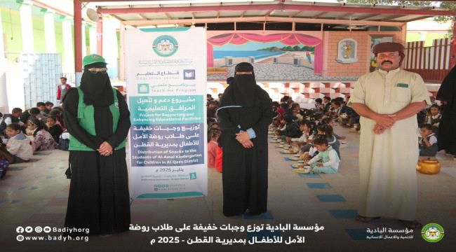 إطار جهودها المستمرة لدعم التعليم ورعاية الأطفال، قامت مؤسسة البادية للتنمية والأعمال الانسانية بتوزيع وجبات خفيفة على طلاب روضة الأمل للأطفال بمديرية القطن البالغ عددهم 254 طالباً وطالبة .