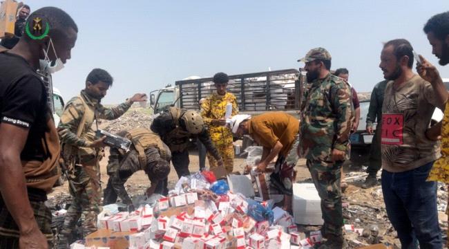 الحزام الأمني يتلف كميات كبيرة من الأدوية المخدرة والمبيدات والسجائر المهربة