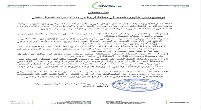أصدرت شركة بترومسيلة بيانًا رسميًا توضح فيه موقفها من الجدل الدائر حول الأنبوب الممتد في منطقة قريبة من منشآت ميناء الضبة النفطي، مؤكدة عدم صلتها بأي أعمال إنشائية خارج حدود وأسوار الميناء.