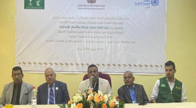 نظمت وزارة الصحة العامة والسكان، بالتعاون مع منظمة الصحة العالمية وبدعم من مركز الملك سلمان للإغاثة والأعمال الإنسانية، اليوم، بالعاصمة عدن، برنامج تدريبي في معالجة حالات الكوليرا ومكافحة العدوى.