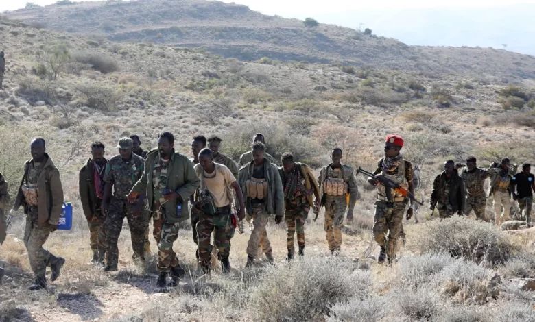 قوات أمن بونتلاند تسير في تشكيل بقرية بالي ديدين بمنطقة بري (رويترز)