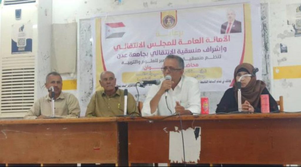 نظمت منسقية المجلس الانتقالي الجنوبي بكلية صبر للعلوم والتربية، اليوم الأربعاء، محاضرة بعنوان “رؤية وأهداف المجلس الانتقالي ومضامين الميثاق الوطني الجنوبي”، بحضور عضو المنسقية العليا لجامعة عدن الدكتور الخضر عسكر ورئيس منسقية كلية صبر للعلوم والتربية الدكتور عبد المجيب حسين مثنى، وعدد من النخب الأكاديمية والطلاب وشخصيات محلية.