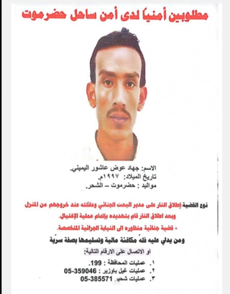 وأكد التعميم ”أنّ المطلوب الأمني جهاد عوض عاشور اليميني متهم في إطلاق النار على مدير البحث الجنائي وعائلته عند خروجهم من المنزل بمديرية غيل باوزير، وبعد فشل محاولته، قام بتهديد مدير البحث بإتمام عملية الإغتيال في المرة القادمة، ومتهم أيضًا في قضية جنائية منظورة أمام النيابة الجزائية المتخصصة بحضرموت“.