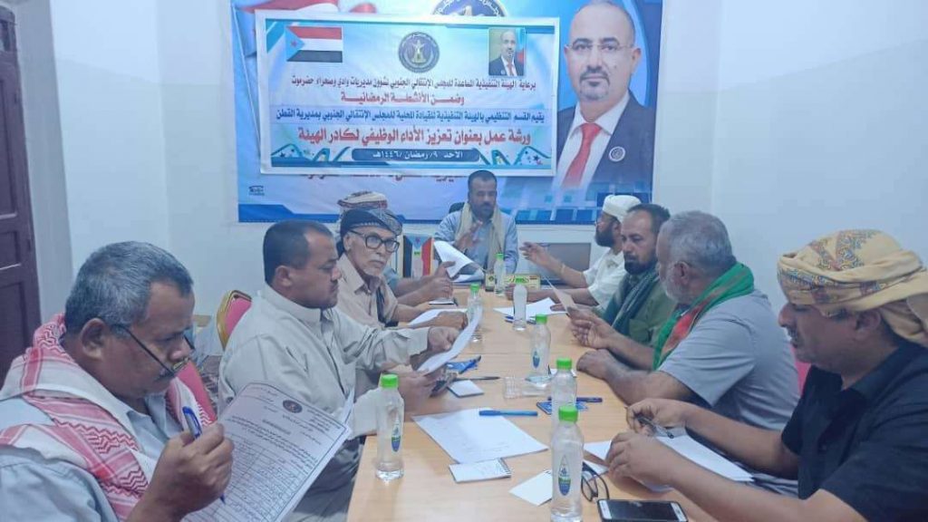 نظم القسم التنظيمي بالهيئة التنفيذية للقيادة المحلية للمجلس الانتقالي الجنوبي في مديرية القطن بمحافظة حضرموت، مساء الأحد، ورشة عمل بعنوان “تعزيز الأداء الوظيفي لكادر الهيئة”، برعاية الهيئة التنفيذية المساعدة للمجلس الانتقالي الجنوبي لشؤون مديريات الوادي والصحراء.