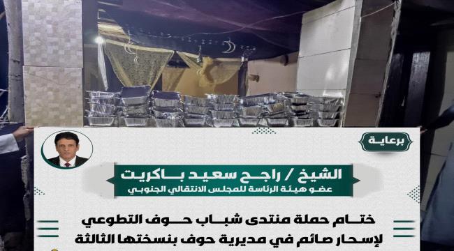 اختتم منتدى شباب حوف التطوعي حملة “سحور صائم”، والتي استمرت منذ بداية شهر رمضان المبارك وحتى مساء امس، وذلك برعاية كريمة من الشيخ راجح سعيد باكريت عضو هيئة رئاسة المجلس الانتقالي الجنوبي.