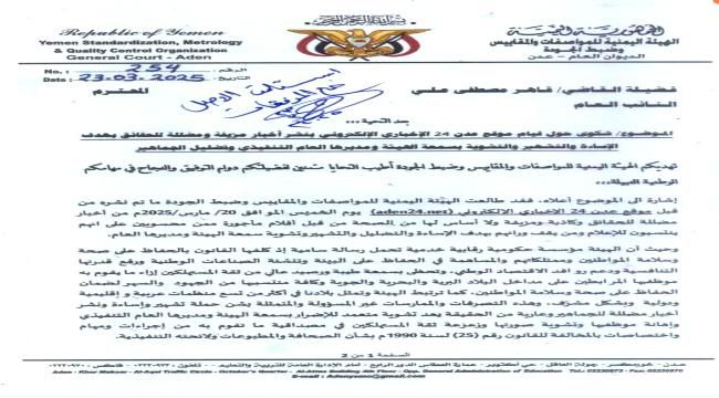 قدمت هيئة المواصفات والمقاييس وضبط الجودة شكوى رسمية إلى فضيلة نائب عام الجمهورية، ضد ما وصفته بحملات تشويه إعلامية ممنهجة تستهدف الهيئة وقيادتها.وجاء في مذكرة الشكوى التي حملت الرقم (254) والمؤرخة في 23 مارس 2025، أن بعض الأقلام المأجورة، ممن يدّعون الانتماء إلى الوسط الإعلامي، قاموا بنشر أخبار مغلوطة ومضللة تهدف إلى الإساءة لسمعة الهيئة وتشويه صورة مديرها العام التنفيذي، فضلاً عن زعزعة ثقة المستهلكين بما تقوم به الهيئة من مهام وطنية تتصل بسلامة وصحة المواطنين.وأوضحت الهيئة أن تلك الأخبار الكاذبة تفتقر إلى أدنى درجات المهنية والمصداقية، وتستهدف النيل من مؤسسة حكومية لها دور محوري في حماية المستهلك وتمثيل البلد في أكثر من تسع منظمات عربية وإقليمية ودولية بشكل مشرّف.وطالبت الهيئة في شكواها بفتح تحقيق شامل حول الجهات التي تقف وراء تلك الأخبار الكاذبة ومحاسبة المتورطين، وذلك استناداً إلى القانون رقم (25) لسنة 1990م بشأن الصحافة والمطبوعات ولائحته التنفيذية، معتبرة أن ما يجري يمثل مخالفة صريحة للقانون ويشكل جريمة يعاقب عليها.وأكدت الهيئة أن مثل هذه الممارسات من شأنها التأثير سلباً على الوضع الاقتصادي العام، وإثارة البلبلة بين المواطنين من خلال بث معلومات مغلوطة تمس مصلحة الوطن والمستهلك على حد سواء.