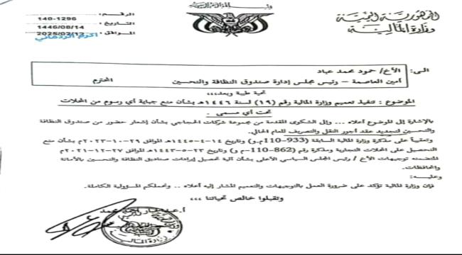 كشفت مذكرة موجهة من وزارة المالية في حكومة عصابة الحوثي الايرانية غير المعترف بها، إلى القيادي الحوثي حمود عباد المُعيّن من قبل العصابة أمينًا للعاصمة، عن خلافات بين الجهات الحوثية حول جبايات النظافة.