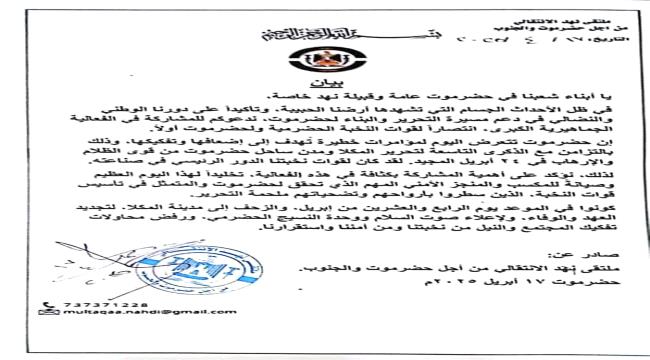 كونوا في الموعد يوم الرابع والعشرين من إبريل، والزحف إلى مدينة المكلا، لتجديد العهد والوفاء، ولإعلاء صوت السلام ووحدة النسيج الحضرمي، ورفض محاولات تفكيك المجتمع والنيل من نخبتنا ومن أمننا واستقرارنا.