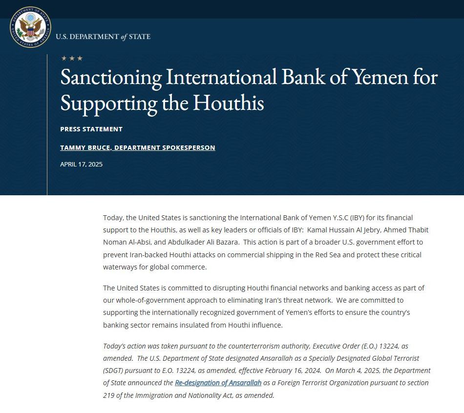 أعلنت الولايات المتحدة الأمريكية، فرض عقوبات على بنك اليمن الدولي وعدد من مسؤوليه، بسبب تقديمهم دعماً مالياً لجماعة الحوثي المدعومة من إيران، في خطوة تأتي ضمن جهود واشنطن لتعطيل الشبكات المالية للجماعة ومنع هجماتهم على الشحن التجاري في البحر الأحمر.