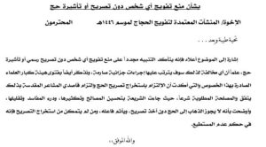 واكدت الوزارة في تعميم موجه إلى المنشآت المعتمدة لتفويج الحجاج لموسم ١٤٤٦هـ، أن أي مخالفة لذلك سوف يترتب عليها إجراءات جزائية صارمة..مشيرة إلى فتوى هيئة كبار العلماء الصادرة بهذا الخصوص والتي أكدت أن الالتزام باستخراج تصريح الحج والتزام قاصدي المشاعر المقدسة بذلك يتفق مع المصلحة المطلوبة شرعاً .