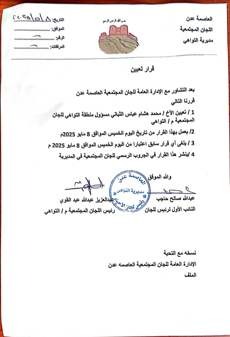 أصدرت قيادة اللجان المجتمعية في العاصمة عدن ومديرية التواهي قراراً رسمياً بتعيين الإعلامي والمناضل محمد هشام عباس الثباتي مسؤولاً للجان المجتمعية منطقة التواهي.