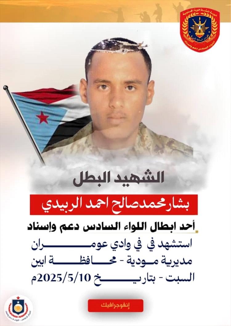 توفي الجندي بشار محمد صالح الربيدي، أحد منتسبي اللواء السادس دعم وإسناد، إثر تعرضه للدغة ثعبان سام أثناء نومه في أحد المواقع العسكرية بوادي عومران.