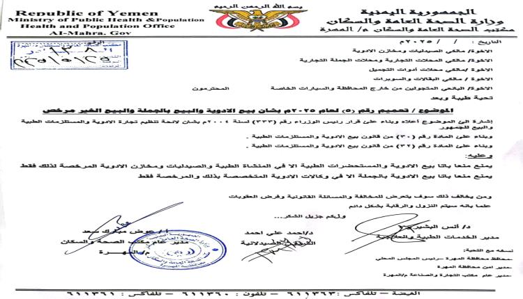 أصدر مكتب وزارة الصحة العامة والسكان بمحافظة المهرة، تعميماً رسمياً يقضي بمنع بيع الأدوية والمستلزمات الطبية بالجملة والتجزئة دون الحصول على التراخيص اللازمة، وذلك استناداً إلى قرار رئيس الوزراء رقم (333) لعام 2004 بشأن تنظيم تجارة الأدوية والمستلزمات الطبية.