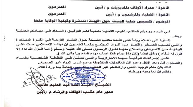 دعا مكتب الأوقاف والإرشاد بمحافظة أبين خطباء المساجد إلى تخصيص خطبة الجمعة القادمة للتوعية بمخاطر الأوبئة وسبل الوقاية منها، في ظل تزايد الإصابات ببعض الأمراض الموسمية في عدد من المناطق.