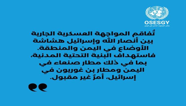 وقال المبعوث الأممي : تُفاقم المواجهة العسكرية الجارية بين الحوثيين وإسرائيل هشاشة الأوضاع في اليمن والمنطقة. فاستهداف البنية التحتية المدنية، بما في ذلك مطار صنعاء في اليمن ومطار بن غوريون في إسرائيل، أمرٌ غير مقبول.
