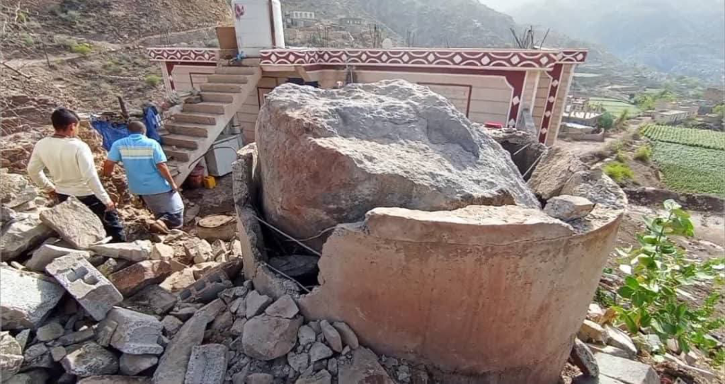 وبحسب شهود عيان وخبراء محليين، فإن الصخرة التي يُقدّر وزنها بعشرات الأطنان، استقرت داخل خزان مياه إسمنتي تابع لمنزل المواطن فهمي أحمد العاقل الحصوري، ما تسبب في تدمير الخزان وسقوط جزء من سور المنزل نتيجة لقوة الاصطدام.