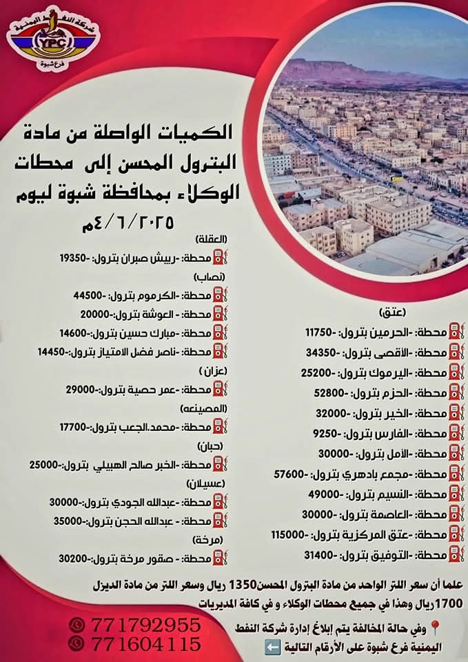 أعلنت شركة النفط اليمنية – فرع محافظة شبوة، اليوم، عن وصول كميات جديدة من مادتي البترول والديزل إلى محطات وكلائها المنتشرة في جميع مديريات المحافظة، في إطار جهودها لضمان الاستقرار التمويني وتلبية احتياجات المواطنين من المشتقات النفطية.