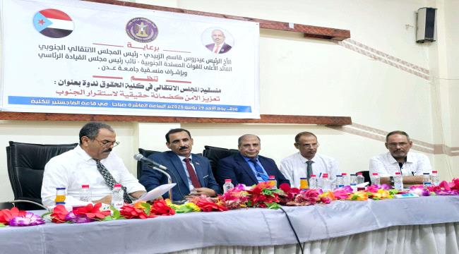 نظمت منسقية المجلس الانتقالي الجنوبي في كلية الحقوق بجامعة عدن، اليوم الأحد، ندوة أكاديمية بعنوان “تعزيز الأمن كضمانة حقيقية لاستقرار الجنوب”.