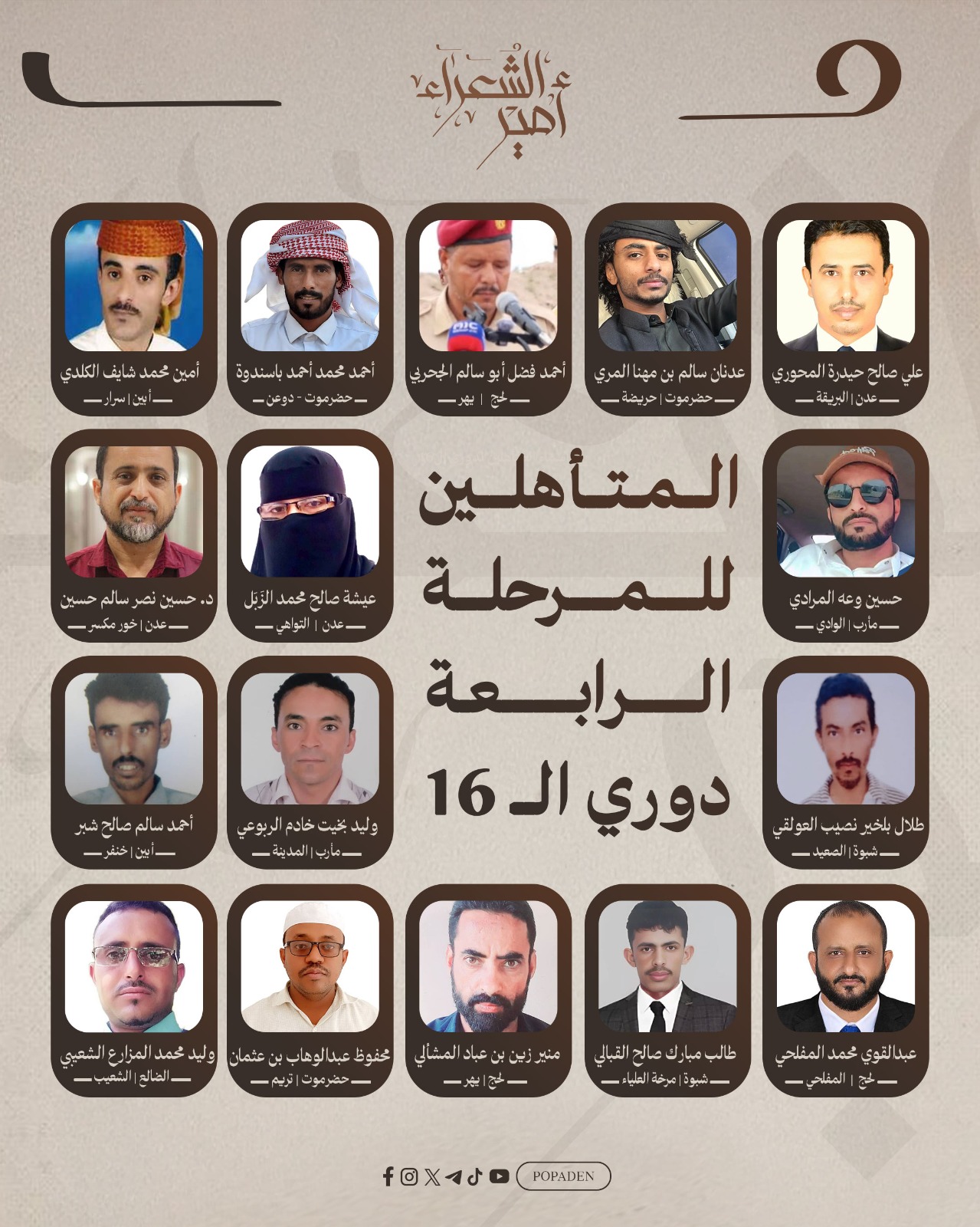 أعلنت لجنة تحكيم مسابقة أمير الشعراء اليوم عن تأهل 16 شاعراً من أصل 32، بعد جولة ثالثة حافلة بالتحدي حملت طابع المجاراة الشعرية باللهجة العامية على بيت شعري للشاعر الراحل أحمد سعيد بلعيدي المرقشي، لتنتقل المسابقة بذلك إلى المرحلة الرابعة (دور الـ16)، والتي ستُقام حضوريًا في العاصمة عدن وسط أجواء شعرية مميزة ومنافسة على المراكز وحامل لقب أمير الشعراء.