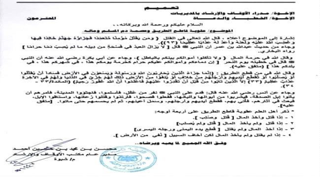 أوقاف شبوة تصدر تعميمًا للخطباء للتحذير من جرائم القتل وقطع الطريق