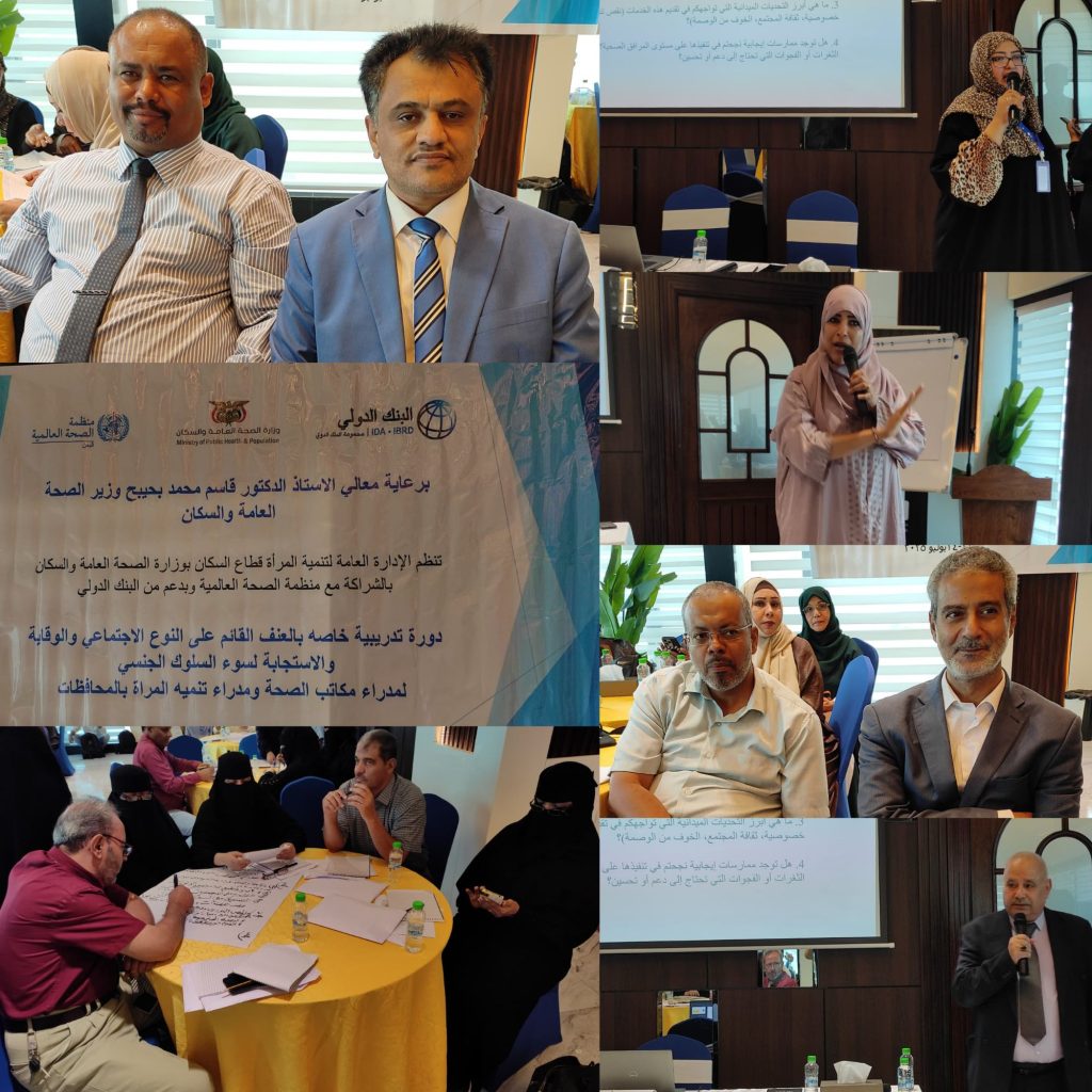 نظمت صباح اليوم الإدارة العامة لتنمية المرأة قطاع السكان بوزارة الصحة العامة والسكان دورة تدريبية خاصة بالعنف القائم على النوع الاجتماعي والوقاية والاستجابة لسوء السلوك الجنسي لمدراء مكاتب الصحة ومدراء تنمية المرأة بالمحافظات بالشراكة مع منظمة الصحة العالمية وبدعم من البنك الدولي برعاية معالي الأستاذ الدكتور قاسم محمد بحبيح وزير الصحة العامة والسكان.