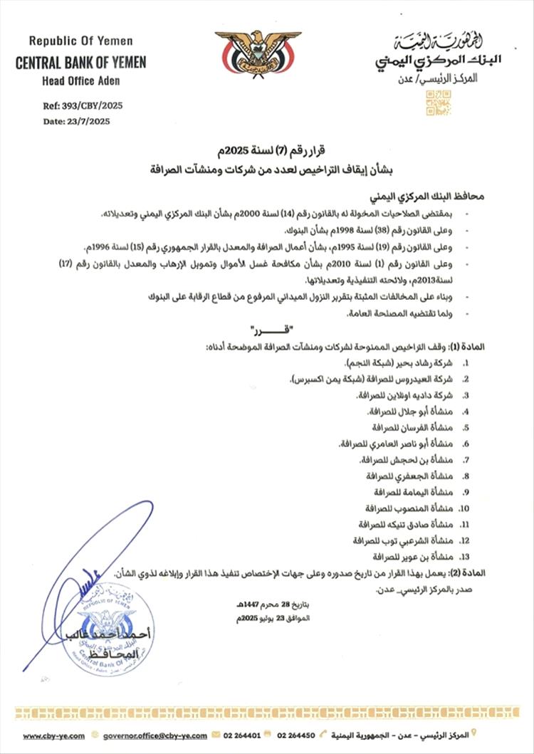 أصدر محافظ البنك المركزي بعدن الأستاذ أحمد أحمد غالب، القرار رقم (7) لسنة 2025، بشأن إيقاف تراخيص عدد من شركات ومنشآت الصرافة المخالفة، استنادًا إلى تقارير النزول الميداني المرفوعة من قطاع الرقابة على البنوك، والتي أثبتت وجود مخالفات جسيمة تستدعي اتخاذ إجراءات قانونية.