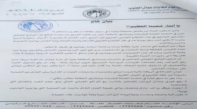 لوّح عمال قطاع النظافة في العاصمة عدن باللجوء إلى خطوات تصعيدية بتنفيذ إضراب عام وشامل، في حال لم تُلبَّ مطالبهم الحقوقية خلال مهلة زمنية محددة لا تتجاوز عشرة أيام.