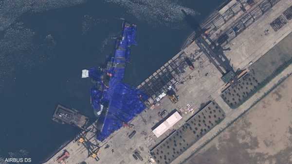 وتظهر الصور الملتقطة عبر الأقمار الاصطناعية، السفينة الحربية مغطاة بأغطية زرقاء، ومستلقية على جانبها ومقدمتها على اليابسة، بينما جزء كبير من مؤخرتها في الماء.
