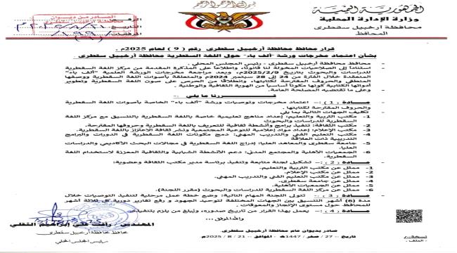 ويأتي القرار تتويجاً لجهود علمية وثقافية متواصلة، هدفها صون اللغة السقطرية العريقة التي تمثل ركناً أصيلاً من هوية الأرخبيل وتراثه الإنساني الفريد. واستند القرار إلى المذكرة المقدمة من مركز اللغة السقطرية للدراسات والبحوث متضمنة توصيات الورشة العلمية التي عُقدت في سبتمبر 2024م.