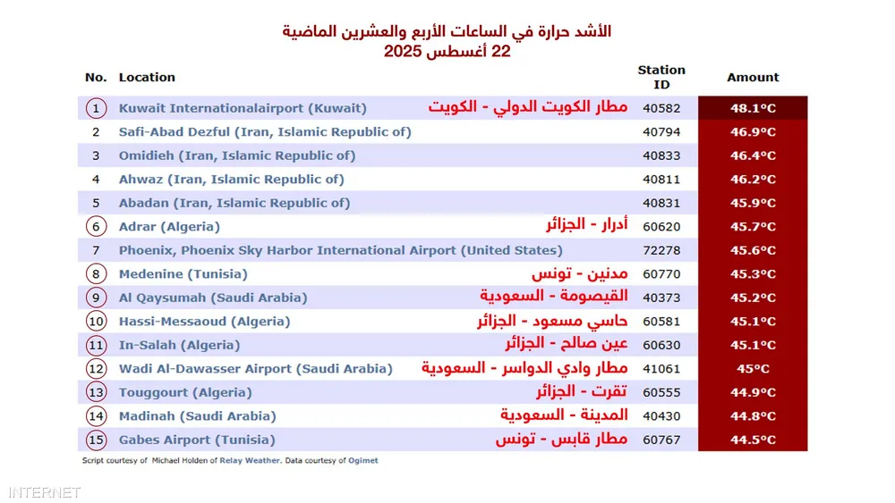 وجاءت مدينة أدرار الجزائرية في المركز الثاني عربيا، وسجلت 45.7 درجة مئوية.