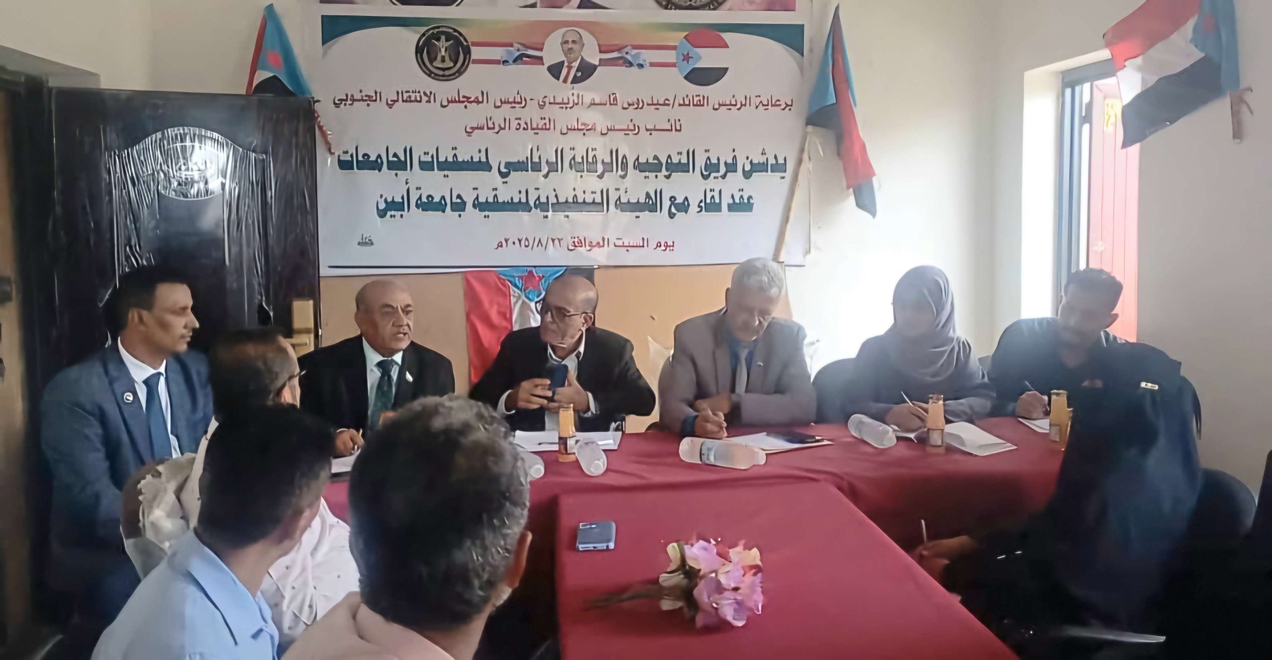 فريق التوجيه والرقابة الرئاسي يعقد لقاءً مع الهيئة التنفيذية لمنسقية المجلس الانتقالي بجامعة أبين