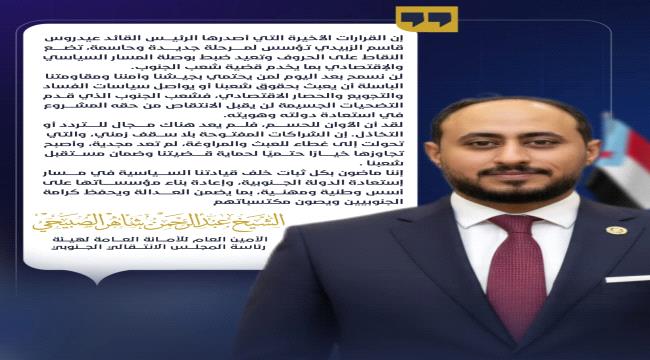 إننا ماضون بكل ثبات خلف قيادتنا السياسية في مسار استعادة الدولة الجنوبية، وإعادة بناء مؤسساتها على أسس وطنية ومهنية، بما يضمن العدالة ويحفظ كرامة الجنوبيين ويصون مكتسباتهم.