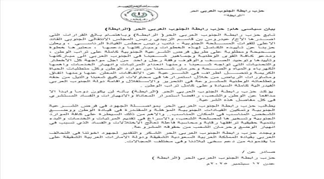 وحث الحزب كافة القوى الوطنية وجماهير الجنوب العربي على تأييد هذه القرارات وتوحيد الصفوف لمواجهة التحديات، بما فيها انعدام المرتبات وانهيار الخدمات الأساسية مثل الكهرباء والمياه والصحة، وكذلك حرمان الشعب من موارد الوطن.