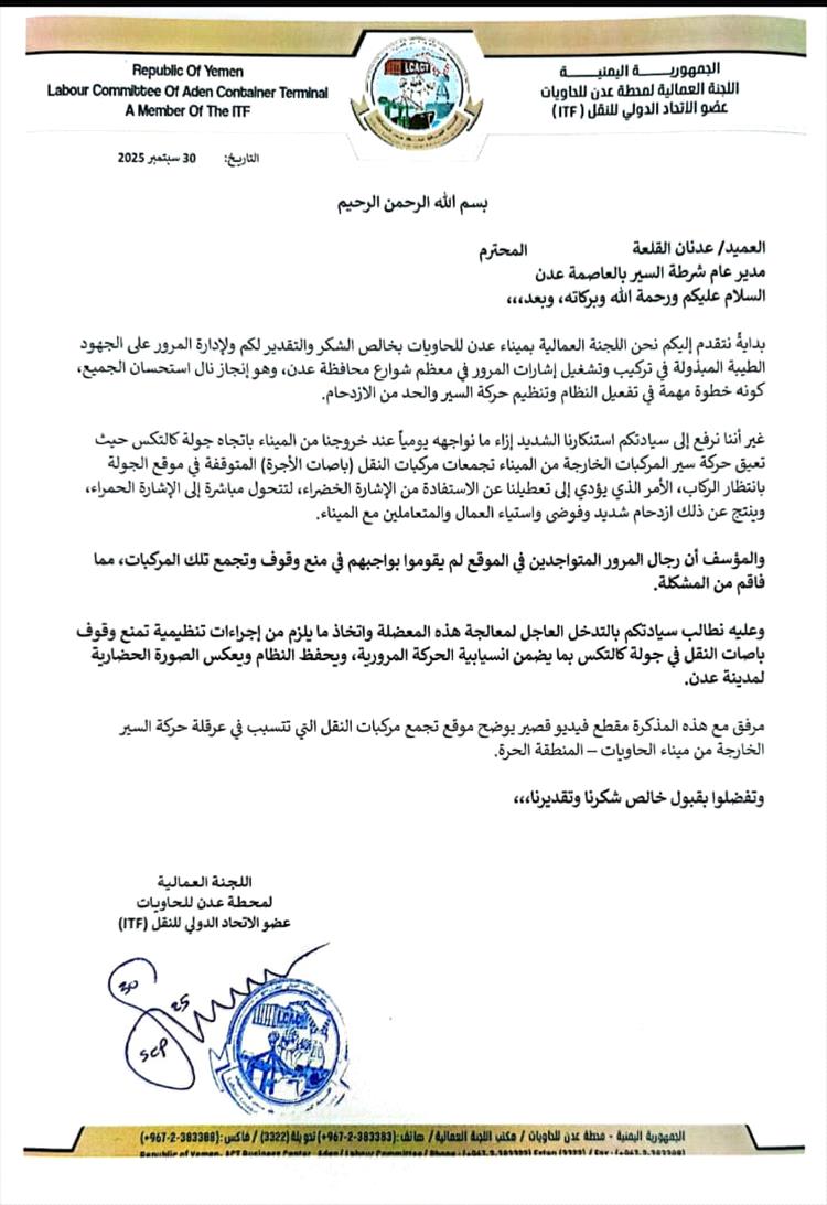 وجهت اللجنة العمالية بمحطة عدن للحاويات، التابعة للاتحاد الدولي للنقل (ITF)، مذكرة إلى العميد عدنان القلعة مدير عام شرطة السير بالعاصمة عدن، أعربت فيها عن تقديرها للجهود المبذولة في تركيب وتشغيل إشارات المرور في شوارع المحافظة، واصفة ذلك بالخطوة المهمة لتنظيم حركة السير والحد من الازدحام.