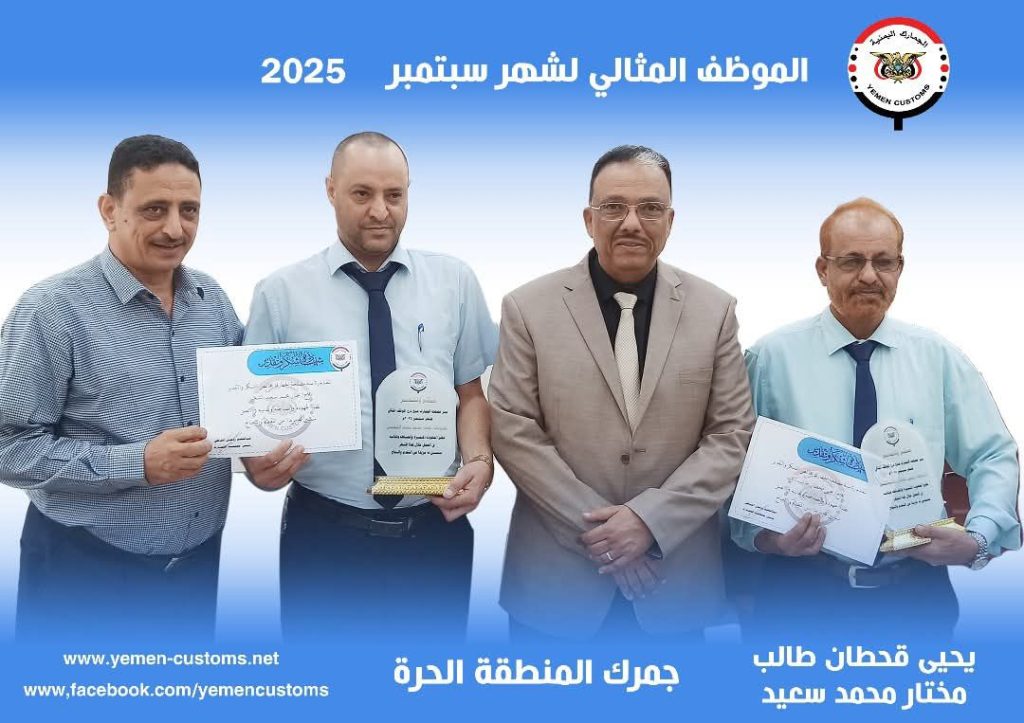 كرم رئيس مصلحة الجمارك الأستاذ عبدالحكيم ردمان القباطي صباح هذا اليوم نائب مدير عام جمرك المنطقة الحرة يحيى قحطان طالب ونائب مدير القيمة مختار محمد سعيد.