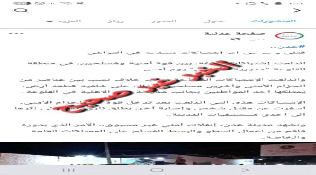 تناقلت بعض الصفحات المعروفة في مواقع التواصل الاجتماعي خبراً حول وقوع اشتباكات مسلحة في مديرية التواهي منطقة القلوعة ونود التوضيح أن الحادثة وقعت قبل ثلاثة أيام وليست كما تم تداوله اليوم.