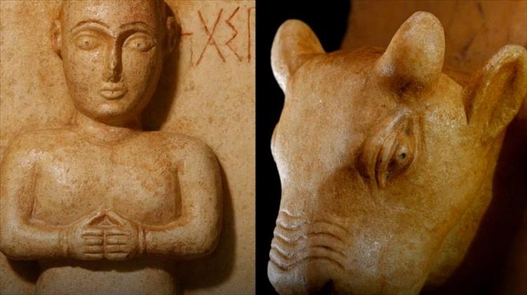 وأوضح محسن أن القطعة الأولى عبارة عن شاهد قبر من مملكة قتبان يعود تاريخه إلى الفترة بين القرن الأول قبل الميلاد والقرن الأول الميلادي، ويُظهر رأس ثور منحوتًا بدقة عالية، تعلوه كتابة بخط المسند القديم.