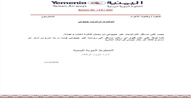 أصدرت الخطوط الجوية اليمنية، الناقل الوطني، تعميمًا جديدًا خاصًا بالمسافرين عبر مطار جيبوتي، تضمن مجموعة من الضوابط والتعليمات المنظمة للسفر الترانزيت.