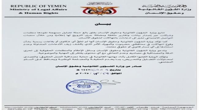 كما أكدت الوزارة أنها ستتخذ جميع الإجراءات القانونية اللازمة لحماية مصداقية العمل الحقوقي، والتصدي لمحاولات التضليل والتحريض، بما يخدم الحقيقة والمصلحة الوطنية، ويحافظ على السلم المجتمعي.